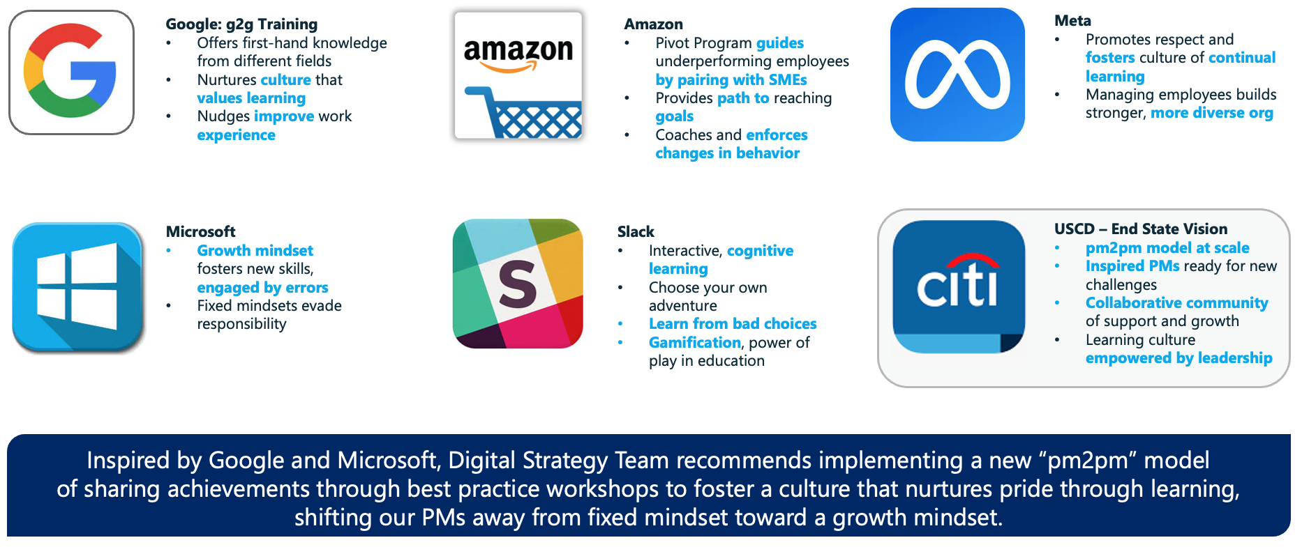 Our organization has the opportunity to enhance its learning agenda by addressing existing skills needs of our Product Managers that have gone unmet, and applying lessons learned from industry leaders and best practices: